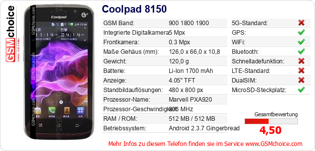 Hast du eigene Webseite? Willst du die Informationen über Standarddaten des Handys Coolpad 8150 irgendwo veröffentlichen? Das ist sehr einfach. Du kannst das Bild herunterladen oder kopieren und auf der Webseite folgenden Code hinzufügen:Das Einfügen von diesem Code verursacht das Anzeigen von dem folgenden Bild: