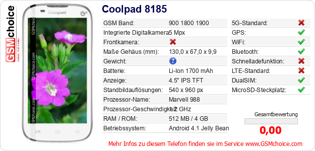 Hast du eigene Webseite? Willst du die Informationen über Standarddaten des Handys Coolpad 8185 irgendwo veröffentlichen? Das ist sehr einfach. Du kannst das Bild herunterladen oder kopieren und auf der Webseite folgenden Code hinzufügen:Das Einfügen von diesem Code verursacht das Anzeigen von dem folgenden Bild: