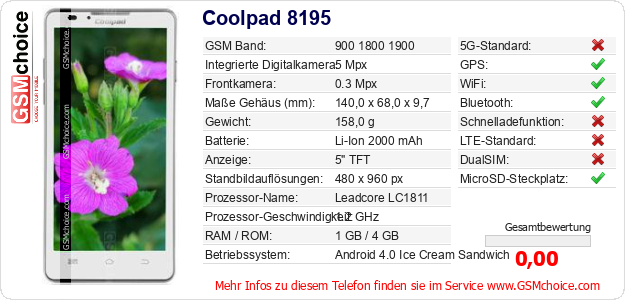 Hast du eigene Webseite? Willst du die Informationen über Standarddaten des Handys Coolpad 8195 irgendwo veröffentlichen? Das ist sehr einfach. Du kannst das Bild herunterladen oder kopieren und auf der Webseite folgenden Code hinzufügen:Das Einfügen von diesem Code verursacht das Anzeigen von dem folgenden Bild: