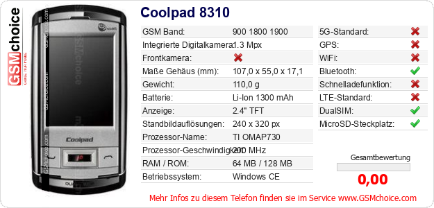 Hast du eigene Webseite? Willst du die Informationen über Standarddaten des Handys Coolpad 8310 irgendwo veröffentlichen? Das ist sehr einfach. Du kannst das Bild herunterladen oder kopieren und auf der Webseite folgenden Code hinzufügen:Das Einfügen von diesem Code verursacht das Anzeigen von dem folgenden Bild:
