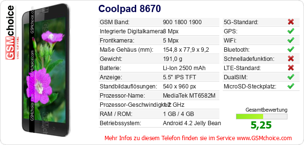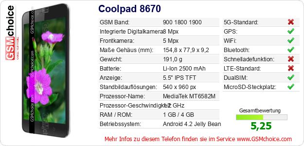 Hast du eigene Webseite? Willst du die Informationen über Standarddaten des Handys Coolpad 8670 irgendwo veröffentlichen? Das ist sehr einfach. Du kannst das Bild herunterladen oder kopieren und auf der Webseite folgenden Code hinzufügen:Das Einfügen von diesem Code verursacht das Anzeigen von dem folgenden Bild: