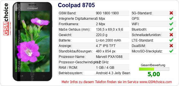 Hast du eigene Webseite? Willst du die Informationen über Standarddaten des Handys Coolpad 8705 irgendwo veröffentlichen? Das ist sehr einfach. Du kannst das Bild herunterladen oder kopieren und auf der Webseite folgenden Code hinzufügen:Das Einfügen von diesem Code verursacht das Anzeigen von dem folgenden Bild: