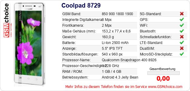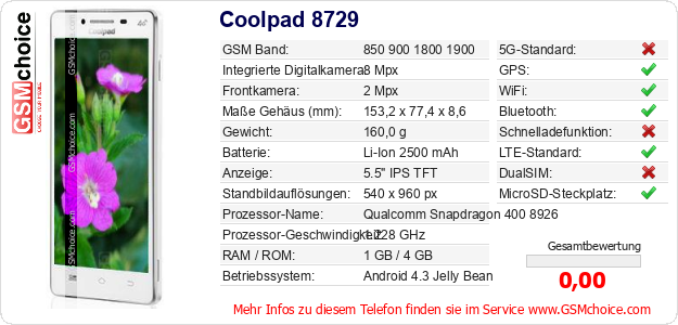 Hast du eigene Webseite? Willst du die Informationen über Standarddaten des Handys Coolpad 8729 irgendwo veröffentlichen? Das ist sehr einfach. Du kannst das Bild herunterladen oder kopieren und auf der Webseite folgenden Code hinzufügen:Das Einfügen von diesem Code verursacht das Anzeigen von dem folgenden Bild: