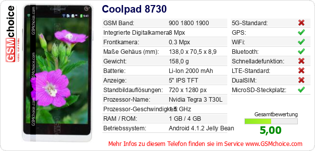 Hast du eigene Webseite? Willst du die Informationen über Standarddaten des Handys Coolpad 8730 irgendwo veröffentlichen? Das ist sehr einfach. Du kannst das Bild herunterladen oder kopieren und auf der Webseite folgenden Code hinzufügen:Das Einfügen von diesem Code verursacht das Anzeigen von dem folgenden Bild: