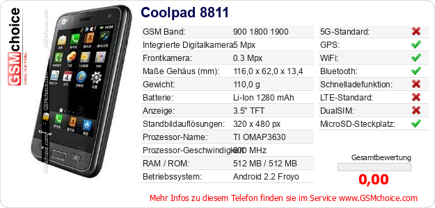 Hast du eigene Webseite? Willst du die Informationen über Standarddaten des Handys Coolpad 8811 irgendwo veröffentlichen? Das ist sehr einfach. Du kannst das Bild herunterladen oder kopieren und auf der Webseite folgenden Code hinzufügen:Das Einfügen von diesem Code verursacht das Anzeigen von dem folgenden Bild: