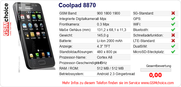 Hast du eigene Webseite? Willst du die Informationen über Standarddaten des Handys Coolpad 8870 irgendwo veröffentlichen? Das ist sehr einfach. Du kannst das Bild herunterladen oder kopieren und auf der Webseite folgenden Code hinzufügen:Das Einfügen von diesem Code verursacht das Anzeigen von dem folgenden Bild: