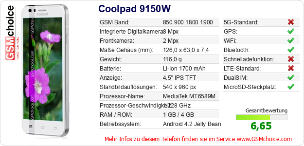 Hast du eigene Webseite? Willst du die Informationen über Standarddaten des Handys Coolpad 9150W irgendwo veröffentlichen? Das ist sehr einfach. Du kannst das Bild herunterladen oder kopieren und auf der Webseite folgenden Code hinzufügen:Das Einfügen von diesem Code verursacht das Anzeigen von dem folgenden Bild: