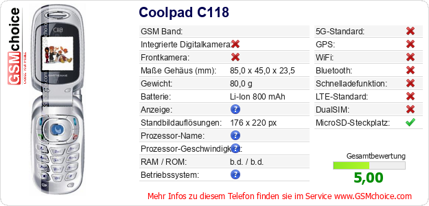 Hast du eigene Webseite? Willst du die Informationen über Standarddaten des Handys Coolpad C118 irgendwo veröffentlichen? Das ist sehr einfach. Du kannst das Bild herunterladen oder kopieren und auf der Webseite folgenden Code hinzufügen:Das Einfügen von diesem Code verursacht das Anzeigen von dem folgenden Bild: