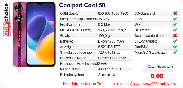 Hast du eigene Webseite? Willst du die Informationen über Standarddaten des Handys Coolpad Cool 50 irgendwo veröffentlichen? Das ist sehr einfach. Du kannst das Bild herunterladen oder kopieren und auf der Webseite folgenden Code hinzufügen:Das Einfügen von diesem Code verursacht das Anzeigen von dem folgenden Bild: