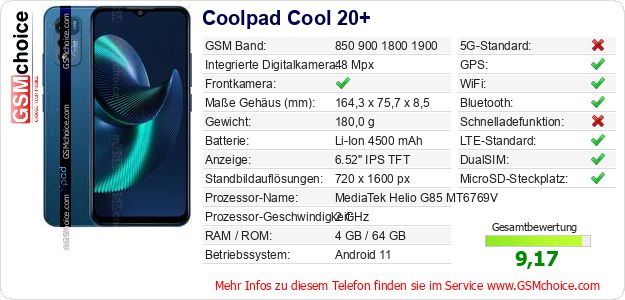 Hast du eigene Webseite? Willst du die Informationen über Standarddaten des Handys Coolpad Cool 20+ irgendwo veröffentlichen? Das ist sehr einfach. Du kannst das Bild herunterladen oder kopieren und auf der Webseite folgenden Code hinzufügen:Das Einfügen von diesem Code verursacht das Anzeigen von dem folgenden Bild: