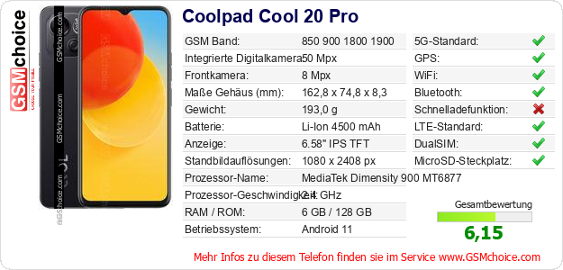 Hast du eigene Webseite? Willst du die Informationen über Standarddaten des Handys Coolpad Cool 20 Pro irgendwo veröffentlichen? Das ist sehr einfach. Du kannst das Bild herunterladen oder kopieren und auf der Webseite folgenden Code hinzufügen:Das Einfügen von diesem Code verursacht das Anzeigen von dem folgenden Bild: