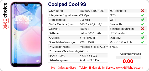 Hast du eigene Webseite? Willst du die Informationen über Standarddaten des Handys Coolpad Cool 9S irgendwo veröffentlichen? Das ist sehr einfach. Du kannst das Bild herunterladen oder kopieren und auf der Webseite folgenden Code hinzufügen:Das Einfügen von diesem Code verursacht das Anzeigen von dem folgenden Bild:
