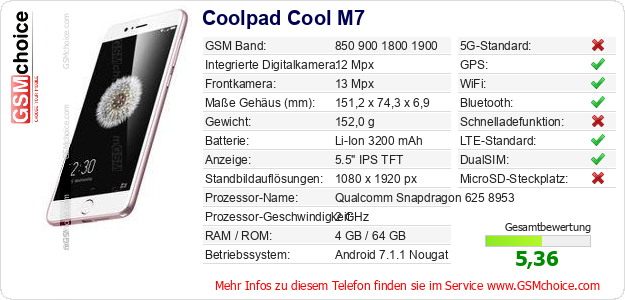 Hast du eigene Webseite? Willst du die Informationen über Standarddaten des Handys Coolpad Cool M7 irgendwo veröffentlichen? Das ist sehr einfach. Du kannst das Bild herunterladen oder kopieren und auf der Webseite folgenden Code hinzufügen:Das Einfügen von diesem Code verursacht das Anzeigen von dem folgenden Bild:
