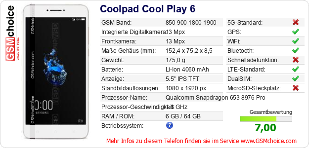 Hast du eigene Webseite? Willst du die Informationen über Standarddaten des Handys Coolpad Cool Play 6 irgendwo veröffentlichen? Das ist sehr einfach. Du kannst das Bild herunterladen oder kopieren und auf der Webseite folgenden Code hinzufügen:Das Einfügen von diesem Code verursacht das Anzeigen von dem folgenden Bild: