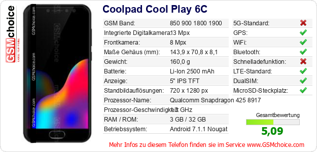 Daten des Mobiltelefons Coolpad Cool Play 6C auf Ihrer Seite