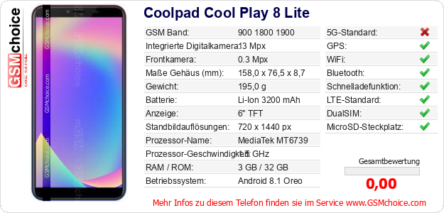 Daten des Mobiltelefons Coolpad Cool Play 8 Lite auf Ihrer Seite