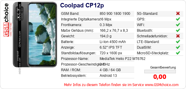 Hast du eigene Webseite? Willst du die Informationen über Standarddaten des Handys Coolpad CP12p irgendwo veröffentlichen? Das ist sehr einfach. Du kannst das Bild herunterladen oder kopieren und auf der Webseite folgenden Code hinzufügen:Das Einfügen von diesem Code verursacht das Anzeigen von dem folgenden Bild: