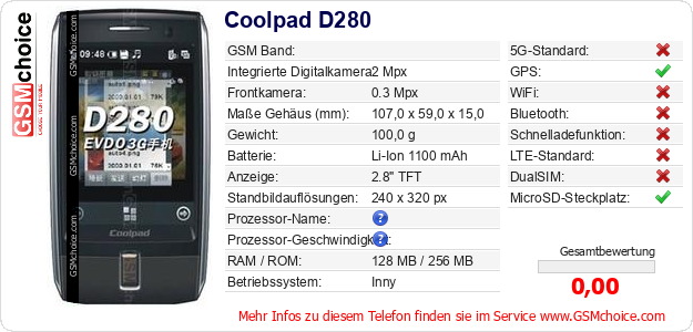 Hast du eigene Webseite? Willst du die Informationen über Standarddaten des Handys Coolpad D280 irgendwo veröffentlichen? Das ist sehr einfach. Du kannst das Bild herunterladen oder kopieren und auf der Webseite folgenden Code hinzufügen:Das Einfügen von diesem Code verursacht das Anzeigen von dem folgenden Bild: