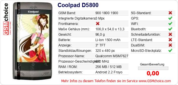 Hast du eigene Webseite? Willst du die Informationen über Standarddaten des Handys Coolpad D5800 irgendwo veröffentlichen? Das ist sehr einfach. Du kannst das Bild herunterladen oder kopieren und auf der Webseite folgenden Code hinzufügen:Das Einfügen von diesem Code verursacht das Anzeigen von dem folgenden Bild: