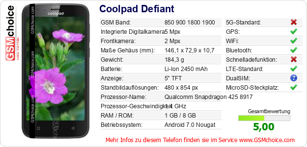 Hast du eigene Webseite? Willst du die Informationen über Standarddaten des Handys Coolpad Defiant irgendwo veröffentlichen? Das ist sehr einfach. Du kannst das Bild herunterladen oder kopieren und auf der Webseite folgenden Code hinzufügen:Das Einfügen von diesem Code verursacht das Anzeigen von dem folgenden Bild: