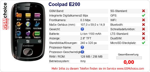 Hast du eigene Webseite? Willst du die Informationen über Standarddaten des Handys Coolpad E200 irgendwo veröffentlichen? Das ist sehr einfach. Du kannst das Bild herunterladen oder kopieren und auf der Webseite folgenden Code hinzufügen:Das Einfügen von diesem Code verursacht das Anzeigen von dem folgenden Bild: