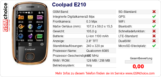 Hast du eigene Webseite? Willst du die Informationen über Standarddaten des Handys Coolpad E210 irgendwo veröffentlichen? Das ist sehr einfach. Du kannst das Bild herunterladen oder kopieren und auf der Webseite folgenden Code hinzufügen:Das Einfügen von diesem Code verursacht das Anzeigen von dem folgenden Bild: