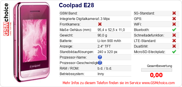 Hast du eigene Webseite? Willst du die Informationen über Standarddaten des Handys Coolpad E28 irgendwo veröffentlichen? Das ist sehr einfach. Du kannst das Bild herunterladen oder kopieren und auf der Webseite folgenden Code hinzufügen:Das Einfügen von diesem Code verursacht das Anzeigen von dem folgenden Bild: