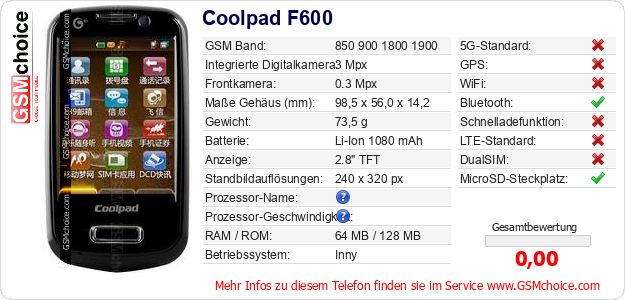Hast du eigene Webseite? Willst du die Informationen über Standarddaten des Handys Coolpad F600 irgendwo veröffentlichen? Das ist sehr einfach. Du kannst das Bild herunterladen oder kopieren und auf der Webseite folgenden Code hinzufügen:Das Einfügen von diesem Code verursacht das Anzeigen von dem folgenden Bild:
