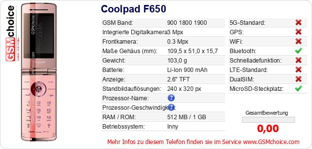 Hast du eigene Webseite? Willst du die Informationen über Standarddaten des Handys Coolpad F650 irgendwo veröffentlichen? Das ist sehr einfach. Du kannst das Bild herunterladen oder kopieren und auf der Webseite folgenden Code hinzufügen:Das Einfügen von diesem Code verursacht das Anzeigen von dem folgenden Bild: