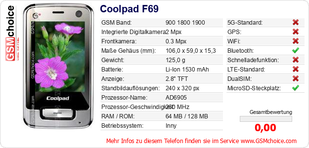Hast du eigene Webseite? Willst du die Informationen über Standarddaten des Handys Coolpad F69 irgendwo veröffentlichen? Das ist sehr einfach. Du kannst das Bild herunterladen oder kopieren und auf der Webseite folgenden Code hinzufügen:Das Einfügen von diesem Code verursacht das Anzeigen von dem folgenden Bild: