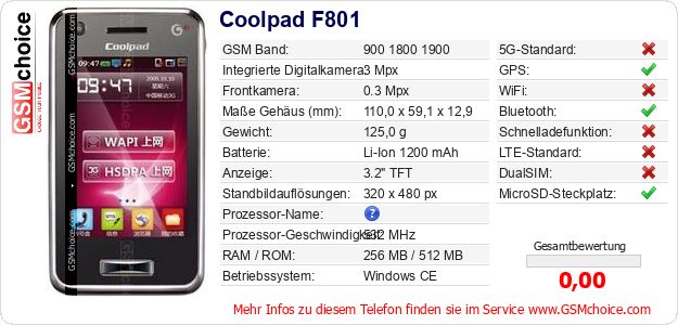 Hast du eigene Webseite? Willst du die Informationen über Standarddaten des Handys Coolpad F801 irgendwo veröffentlichen? Das ist sehr einfach. Du kannst das Bild herunterladen oder kopieren und auf der Webseite folgenden Code hinzufügen:Das Einfügen von diesem Code verursacht das Anzeigen von dem folgenden Bild: