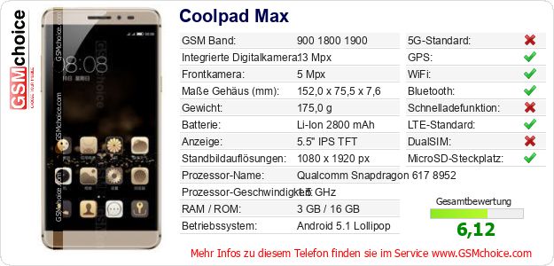 Hast du eigene Webseite? Willst du die Informationen über Standarddaten des Handys Coolpad Max irgendwo veröffentlichen? Das ist sehr einfach. Du kannst das Bild herunterladen oder kopieren und auf der Webseite folgenden Code hinzufügen:Das Einfügen von diesem Code verursacht das Anzeigen von dem folgenden Bild: