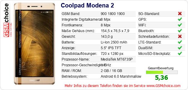 Hast du eigene Webseite? Willst du die Informationen über Standarddaten des Handys Coolpad Modena 2 irgendwo veröffentlichen? Das ist sehr einfach. Du kannst das Bild herunterladen oder kopieren und auf der Webseite folgenden Code hinzufügen:Das Einfügen von diesem Code verursacht das Anzeigen von dem folgenden Bild: