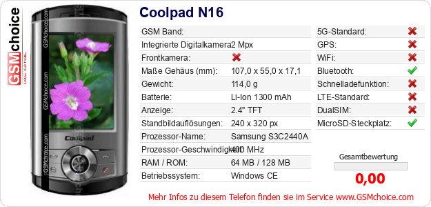 Hast du eigene Webseite? Willst du die Informationen über Standarddaten des Handys Coolpad N16 irgendwo veröffentlichen? Das ist sehr einfach. Du kannst das Bild herunterladen oder kopieren und auf der Webseite folgenden Code hinzufügen:Das Einfügen von diesem Code verursacht das Anzeigen von dem folgenden Bild: