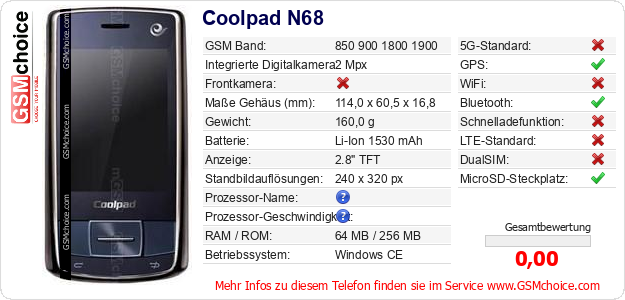 Hast du eigene Webseite? Willst du die Informationen über Standarddaten des Handys Coolpad N68 irgendwo veröffentlichen? Das ist sehr einfach. Du kannst das Bild herunterladen oder kopieren und auf der Webseite folgenden Code hinzufügen:Das Einfügen von diesem Code verursacht das Anzeigen von dem folgenden Bild: