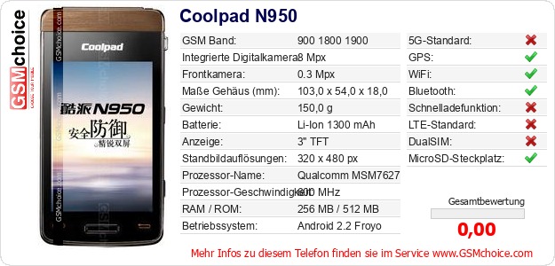 Hast du eigene Webseite? Willst du die Informationen über Standarddaten des Handys Coolpad N950 irgendwo veröffentlichen? Das ist sehr einfach. Du kannst das Bild herunterladen oder kopieren und auf der Webseite folgenden Code hinzufügen:Das Einfügen von diesem Code verursacht das Anzeigen von dem folgenden Bild: