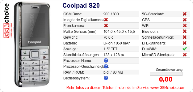 Hast du eigene Webseite? Willst du die Informationen über Standarddaten des Handys Coolpad S20 irgendwo veröffentlichen? Das ist sehr einfach. Du kannst das Bild herunterladen oder kopieren und auf der Webseite folgenden Code hinzufügen:Das Einfügen von diesem Code verursacht das Anzeigen von dem folgenden Bild: