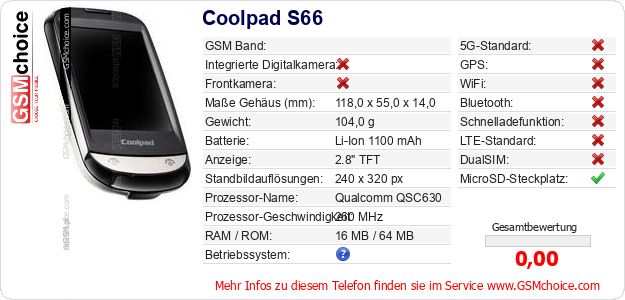 Hast du eigene Webseite? Willst du die Informationen über Standarddaten des Handys Coolpad S66 irgendwo veröffentlichen? Das ist sehr einfach. Du kannst das Bild herunterladen oder kopieren und auf der Webseite folgenden Code hinzufügen:Das Einfügen von diesem Code verursacht das Anzeigen von dem folgenden Bild: