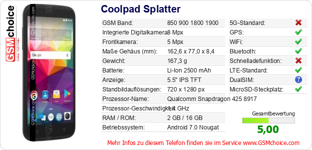 Hast du eigene Webseite? Willst du die Informationen über Standarddaten des Handys Coolpad Splatter irgendwo veröffentlichen? Das ist sehr einfach. Du kannst das Bild herunterladen oder kopieren und auf der Webseite folgenden Code hinzufügen:Das Einfügen von diesem Code verursacht das Anzeigen von dem folgenden Bild: