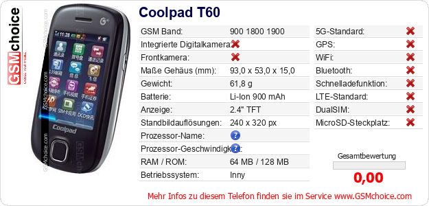 Hast du eigene Webseite? Willst du die Informationen über Standarddaten des Handys Coolpad T60 irgendwo veröffentlichen? Das ist sehr einfach. Du kannst das Bild herunterladen oder kopieren und auf der Webseite folgenden Code hinzufügen:Das Einfügen von diesem Code verursacht das Anzeigen von dem folgenden Bild: