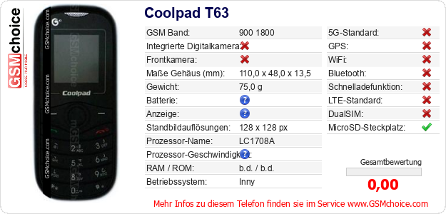 Hast du eigene Webseite? Willst du die Informationen über Standarddaten des Handys Coolpad T63 irgendwo veröffentlichen? Das ist sehr einfach. Du kannst das Bild herunterladen oder kopieren und auf der Webseite folgenden Code hinzufügen:Das Einfügen von diesem Code verursacht das Anzeigen von dem folgenden Bild: