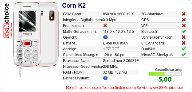 Hast du eigene Webseite? Willst du die Informationen über Standarddaten des Handys Corn K2 irgendwo veröffentlichen? Das ist sehr einfach. Du kannst das Bild herunterladen oder kopieren und auf der Webseite folgenden Code hinzufügen:Das Einfügen von diesem Code verursacht das Anzeigen von dem folgenden Bild: