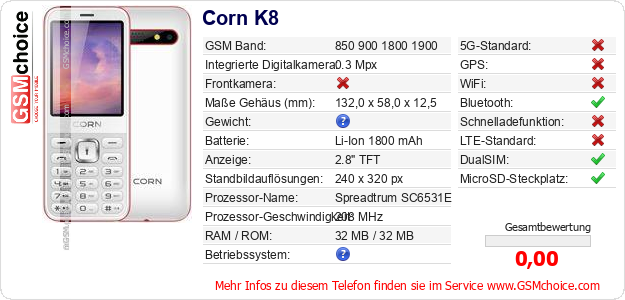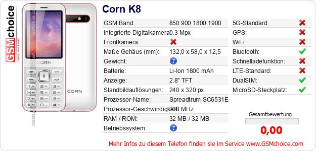 Hast du eigene Webseite? Willst du die Informationen über Standarddaten des Handys Corn K8 irgendwo veröffentlichen? Das ist sehr einfach. Du kannst das Bild herunterladen oder kopieren und auf der Webseite folgenden Code hinzufügen:Das Einfügen von diesem Code verursacht das Anzeigen von dem folgenden Bild: