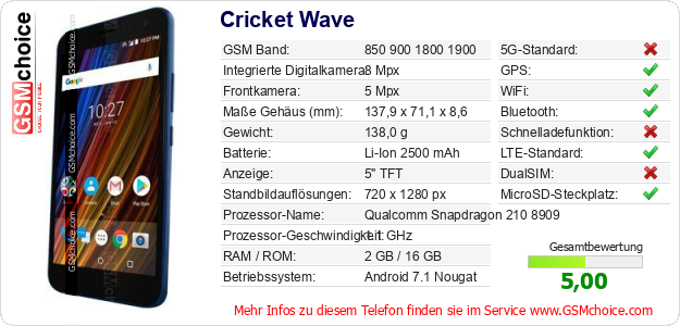 Hast du eigene Webseite? Willst du die Informationen über Standarddaten des Handys Cricket Wave irgendwo veröffentlichen? Das ist sehr einfach. Du kannst das Bild herunterladen oder kopieren und auf der Webseite folgenden Code hinzufügen:Das Einfügen von diesem Code verursacht das Anzeigen von dem folgenden Bild: