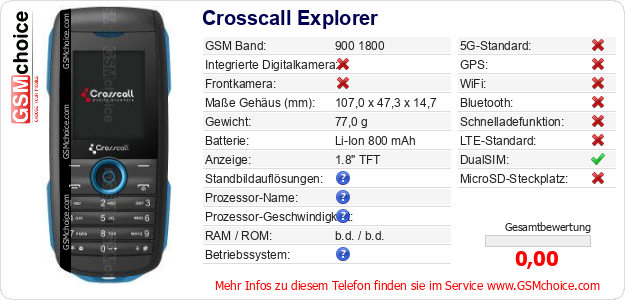 Hast du eigene Webseite? Willst du die Informationen über Standarddaten des Handys Crosscall Explorer irgendwo veröffentlichen? Das ist sehr einfach. Du kannst das Bild herunterladen oder kopieren und auf der Webseite folgenden Code hinzufügen:Das Einfügen von diesem Code verursacht das Anzeigen von dem folgenden Bild: