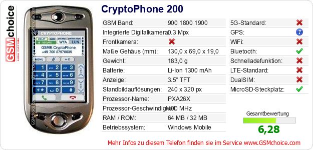 Hast du eigene Webseite? Willst du die Informationen über Standarddaten des Handys CryptoPhone 200 irgendwo veröffentlichen? Das ist sehr einfach. Du kannst das Bild herunterladen oder kopieren und auf der Webseite folgenden Code hinzufügen:Das Einfügen von diesem Code verursacht das Anzeigen von dem folgenden Bild: