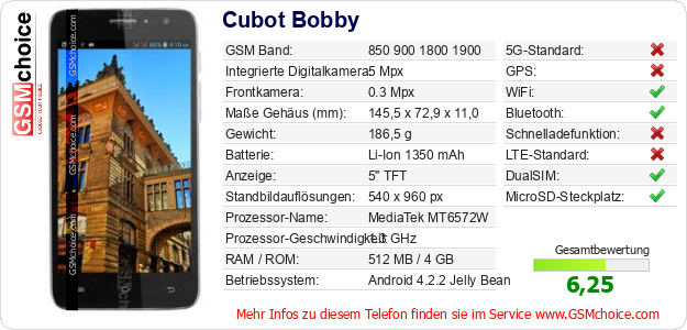 Hast du eigene Webseite? Willst du die Informationen über Standarddaten des Handys Cubot Bobby irgendwo veröffentlichen? Das ist sehr einfach. Du kannst das Bild herunterladen oder kopieren und auf der Webseite folgenden Code hinzufügen:Das Einfügen von diesem Code verursacht das Anzeigen von dem folgenden Bild: