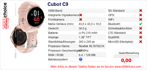 Hast du eigene Webseite? Willst du die Informationen über Standarddaten des Handys Cubot C9 irgendwo veröffentlichen? Das ist sehr einfach. Du kannst das Bild herunterladen oder kopieren und auf der Webseite folgenden Code hinzufügen:Das Einfügen von diesem Code verursacht das Anzeigen von dem folgenden Bild:
