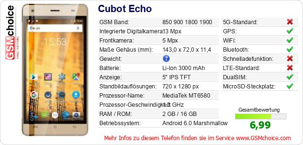 Hast du eigene Webseite? Willst du die Informationen über Standarddaten des Handys Cubot Echo irgendwo veröffentlichen? Das ist sehr einfach. Du kannst das Bild herunterladen oder kopieren und auf der Webseite folgenden Code hinzufügen:Das Einfügen von diesem Code verursacht das Anzeigen von dem folgenden Bild: