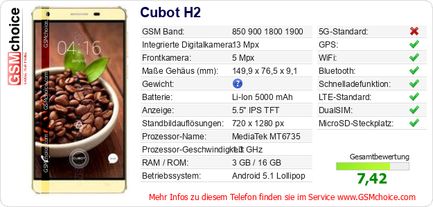 Hast du eigene Webseite? Willst du die Informationen über Standarddaten des Handys Cubot H2 irgendwo veröffentlichen? Das ist sehr einfach. Du kannst das Bild herunterladen oder kopieren und auf der Webseite folgenden Code hinzufügen:Das Einfügen von diesem Code verursacht das Anzeigen von dem folgenden Bild: